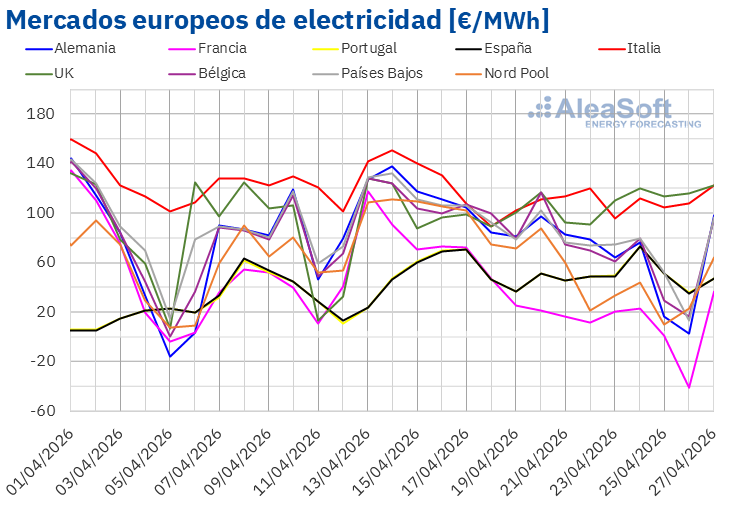 Por lo que respecta a los precios diarios, el mercado francés alcanzó el menor promedio de la semana entre los mercados analizados, de ‑40,83 €/MWh, el domingo 26 de abril. Este fue su precio más bajo desde el 17 de junio de 2013. Por su parte, el 26 de abril, el mercado neerlandés alcanzó su precio diario más bajo desde el 6 de octubre de 2025, de 12,95 €/MWh.